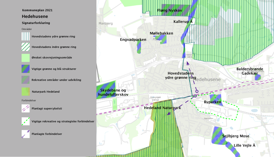 - Byen skal bindes bedre sammen på tværs af de infrastrukturelle barrierer ved at styrke de grønne og blå strukturer. Landskabet uden om byen trækkes ind og skaber forbindelse mellem byens indre grønne loop og det ydre åbne land: Hedeland Naturpark, Solhøj Fælled og Fløng Nyskov. Landskabet øst for Nærheden samt Lille Vejleå er yderligere elementer, der skal skabes forbindelser til i den videre planlægning
