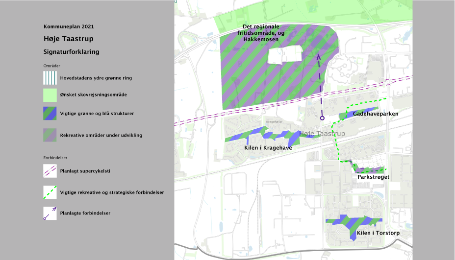 - Det Regionale Fritidsområde og Hakkemosen skal forbindes til resten af byen, så de understøtter det aktive liv og naturoplevelser i hverdagen. Mindre natur- og parkområder skal forbindes til den overordnede grønne og blå struktur