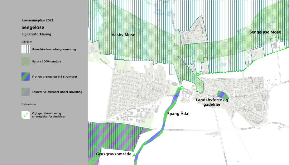 - Der skal skabes bedre adgang til og formidling af dele af det omgivende landskab, der blandt andet består af naturområder mod nord samt Spang Ådal og tidligere grusgravsområder mod syd