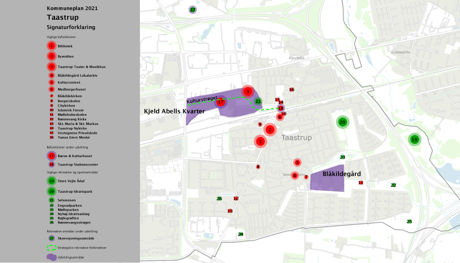 - Kulturstederne Taastrup Teater, Børne & Kulturhuset og Medborgerhuset skal bindes sammen på tværs af byens kvarterer med en tydelig kobling til bymidten og dens urbane byrum og mødesteder
