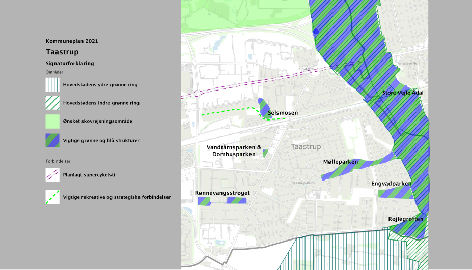- Udvikling af handels- og serviceliv langs Taastrup Hovedgade i sammenspil med byens kulturelle aktiviteter, byrum, funktioner og tilbud, som er attraktive for kommunens borgere og erhvervsliv